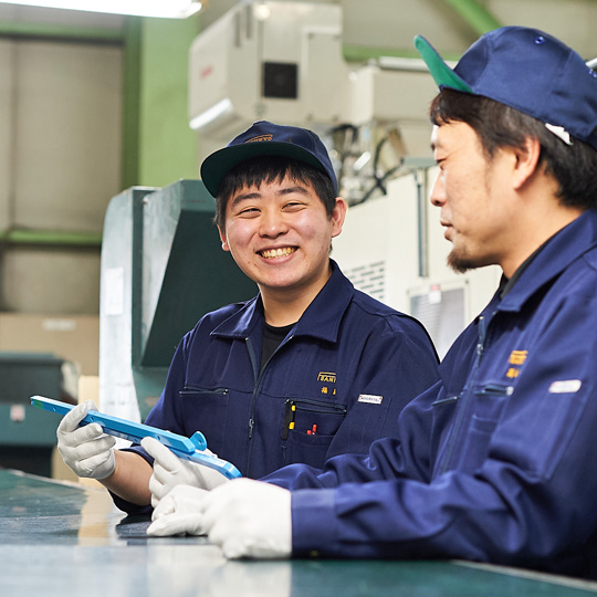 出来上がった製品の検品中には判別しにくいものもあり、難しさを感じるときもありますが、そんな時は迷わず先輩に聞ける雰囲気があるのがこの職場のいいところだと思います。不良品を出さないことを頭に置きながらも、自分自身は材料の種類をしっかりおぼえて、これからの目標はとにかく全てを覚えてスピードアップし、早く先輩方に追いつきたいですね。